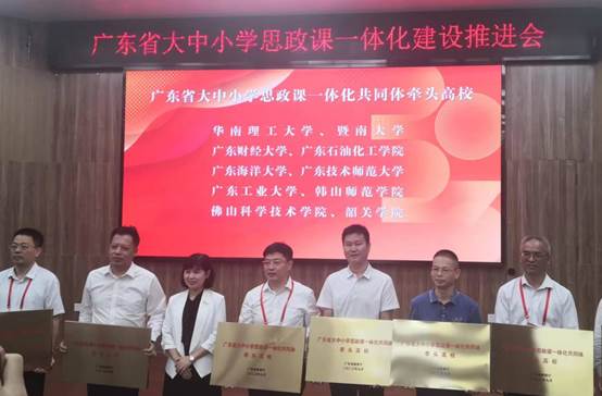 10月20日上午,全省大中小学思政课一体化建设推进会在华南师范大学广州校区石牌校园举行,省委教育工委书记、省教育厅党组书记、厅长朱孔军出席并讲话,我校党委书记杨洲出席会议,并代表学校接受全省大中小学思政课一体化共同体牵头高校牌匾。