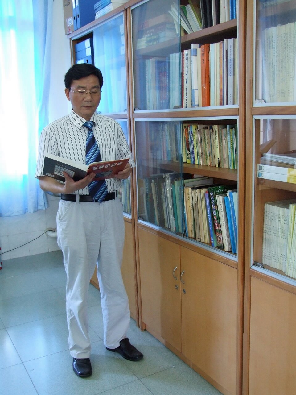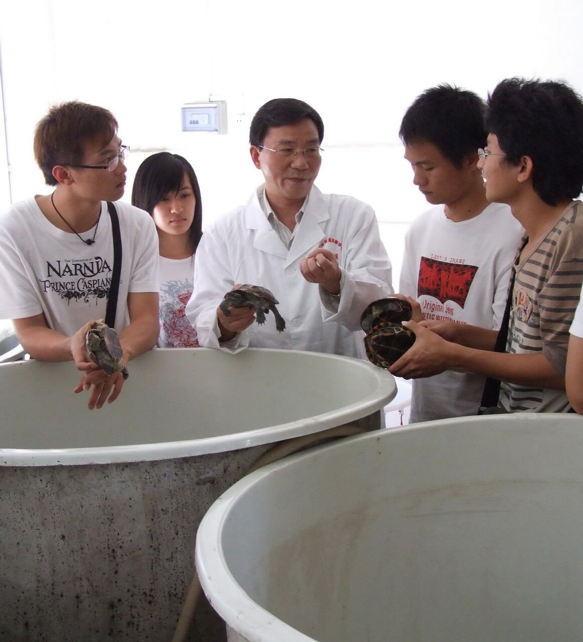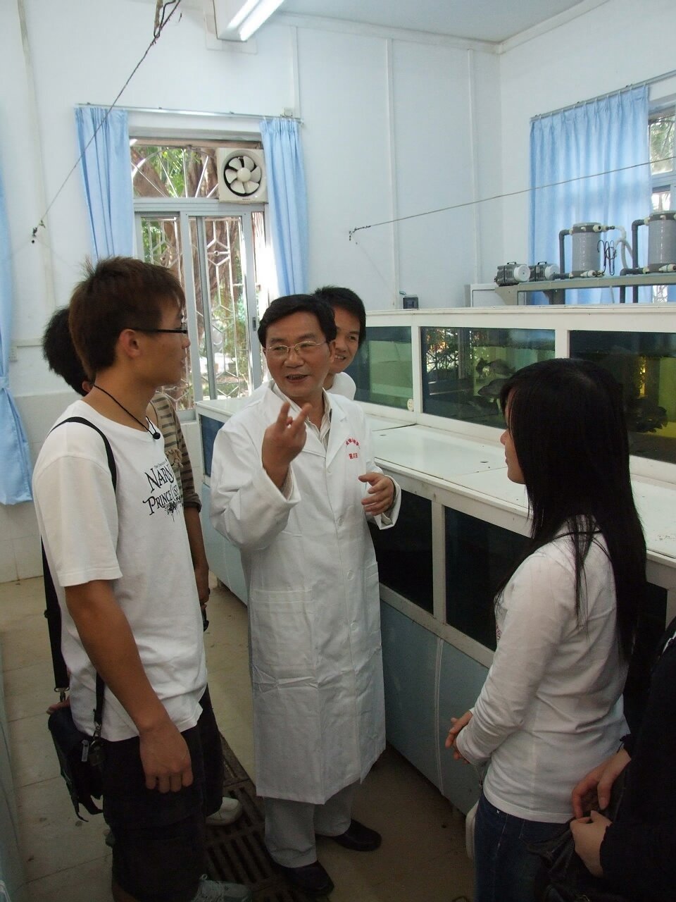 教学互动照片: 1、刘楚吾教授指导学生室内人工孵化鱼苗.jpg 2、刘楚吾教授指导学生进行发育生物学实验.jpg 3、刘楚吾教授指导学生观察鱼类生殖腺的显微结构.jpg 4、刘楚吾教授为学生介绍乌龟的繁殖习性.jpg 5、刘楚吾教授为学生讲解环境对鱼类繁殖性能的影响.jpg 6、刘楚吾教授在查阅资料.jpg
