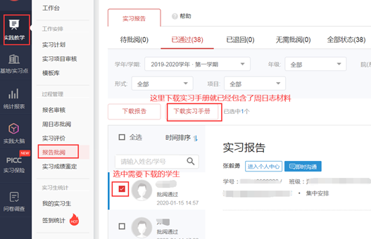 为了保证系统数据存储安全以及方便查阅,教务处将在每学期期中提取上学期的实习周日志及实习报告等数据,供学院存档(注意:设了跨学年学期的课程在相应的两个学期数据导出都有该门课)。