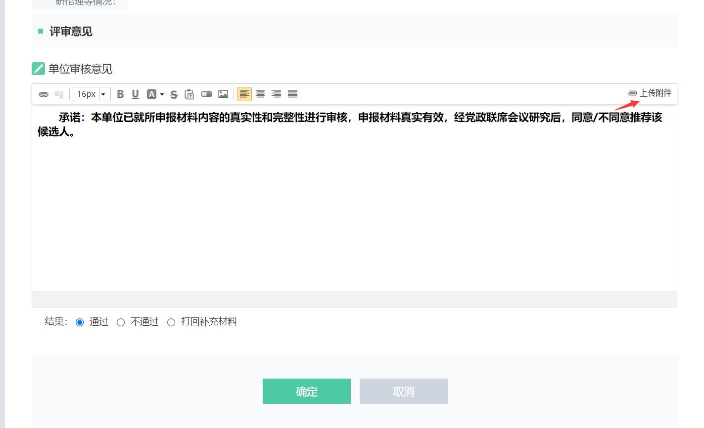 承诺:本单位已就所申报材料内容的真实性和完整性进行审核,申报材料真实有效,经党政联席会议研究后,同意推荐该候选人。