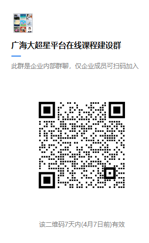 2、为加强交流和学习,请加入企业微信群“广海大超星平台在线课程建设群”,入群老师备注“学院+姓名”实名入群。如有问题可以在企业微信群咨询,已入群的老师请忽略。